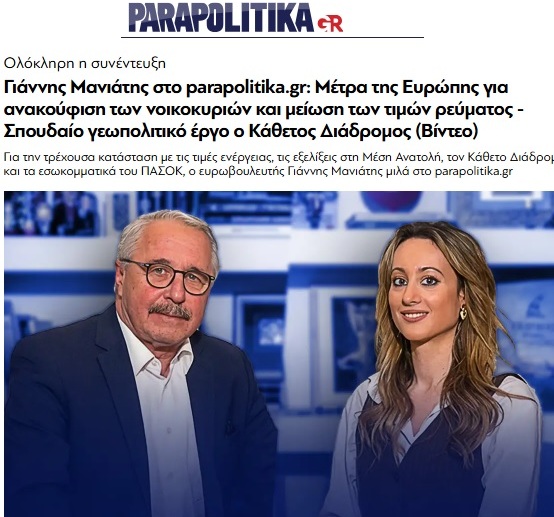 Συνέντευξή μου στα Parapolitika.gr: Mέτρα της Ευρώπης για ανακούφιση των νοικοκυριών και μείωση των τιμών ρεύματος – Σπουδαίο γεωπολιτικό έργο ο Κάθετος Διάδρομος (20.3.2026)