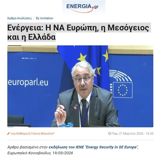 ✍️ Άρθρο μου στο Energia.gr: «Ενέργεια: Η ΝΑ Ευρώπη, η Μεσόγειος και η Ελλάδα»| (Βασισμένο στην εκδήλωση του ΙΕΝΕ “Energy Security in SE Europe”, Ευρωπαϊκό Κοινοβούλιο, 19/03/2026)