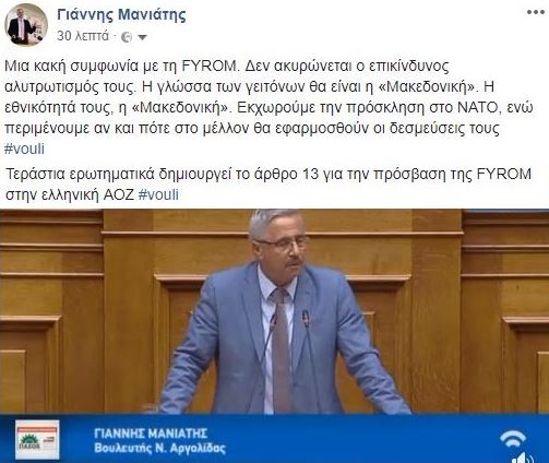 Μια κακή συμφωνία με τη FYROM. Δεν ακυρώνεται ο επικίνδυνος αλυτρωτισμός τους. Η γλώσσα των γειτόνων θα είναι η «Μακεδονική». Η εθνικότητά τους, η «Μακεδονική». Εκχωρούμε την πρόσκληση στο ΝΑΤΟ, ενώ περιμένουμε αν και πότε στο μέλλον θα εφαρμοσθούν οι δεσμεύσεις του #vouli