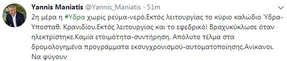 Ανάρτηση Γιάννη Μανιάτη στα social media, για την διακοπή ρεύματος-νερού στην Ύδρα (27.08.2018)