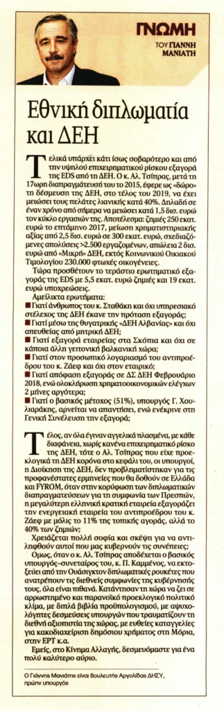 «Εθνική (;) Διπλωματία και ΔΕΗ»