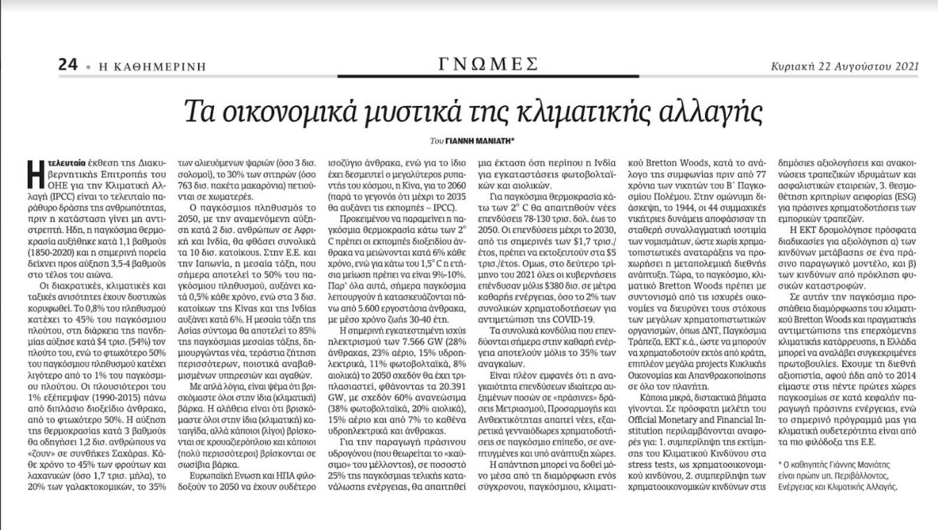 Σε αυτήν την παγκόσμια προσπάθεια διαμόρφωσης του Κλιματικού Bretton Woods και πραγματικής αντιμετώπισης της επερχόμενης Κλιματικής Κατάρρευσης, η Ελλάδα μπορεί να αναλάβει συγκεκριμένες πρωτοβουλίες. Έχουμε τη διεθνή αξιοπιστία, αφού ήδη από το 2014, είμαστε στις 5 πρώτες χώρες παγκοσμίως σε κατά κεφαλήν παραγωγή πράσινης ενέργειας, ενώ το σημερινό πρόγραμμα μας για κλιματική ουδετερότητα, είναι από τα πιο φιλόδοξα της Ε.Ε.
