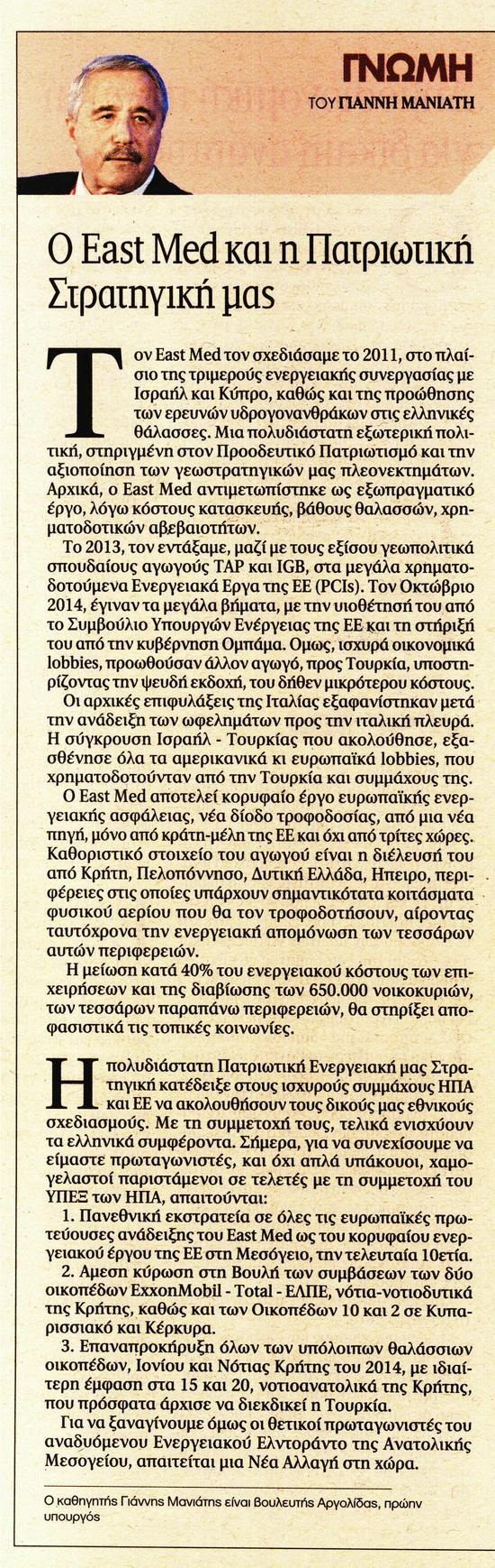 Τον EASTMED τον σχεδιάσαμε το 2011, στο πλαίσιο της τριμερούς ενεργειακής συνεργασίας με Ισραήλ και Κύπρο, καθώς και της προώθησης των ερευνών Υδρογονανθράκων στις ελληνικές θάλασσες. Μια πολυδιάστατη εξωτερική πολιτική, στηριγμένη στον Προοδευτικό Πατριωτισμό και την αξιοποίηση των γεωστρατηγικών μας πλεονεκτημάτων. Αρχικά, ο EASTMED αντιμετωπίστηκε ως εξωπραγματικό έργο, λόγω κόστους κατασκευής, βάθους θαλασσών, χρηματοδοτικών αβεβαιοτήτων.