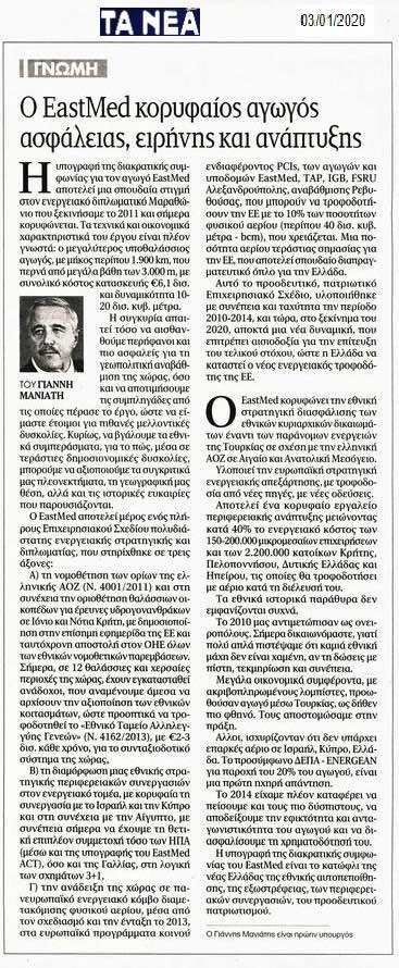 Η υπογραφή της διακρατικής συμφωνίας για τον αγωγό EASTMED, αποτελεί μια σπουδαία στιγμή στον ενεργειακό διπλωματικό Μαραθώνιο που ξεκινήσαμε το 2011 και σήμερα κορυφώνεται. Τα τεχνικά και οικονομικά χαρακτηριστικά του έργου, είναι πλέον γνωστά: ο μεγαλύτερος υποθαλάσσιος αγωγός, με μήκος περίπου 1.900km, που περνά από μεγάλα βάθη των 3.000m, με συνολικό κόστος κατασκευής 6.1δις€ και δυναμικότητα 10-20 δις κυβ μέτρα.