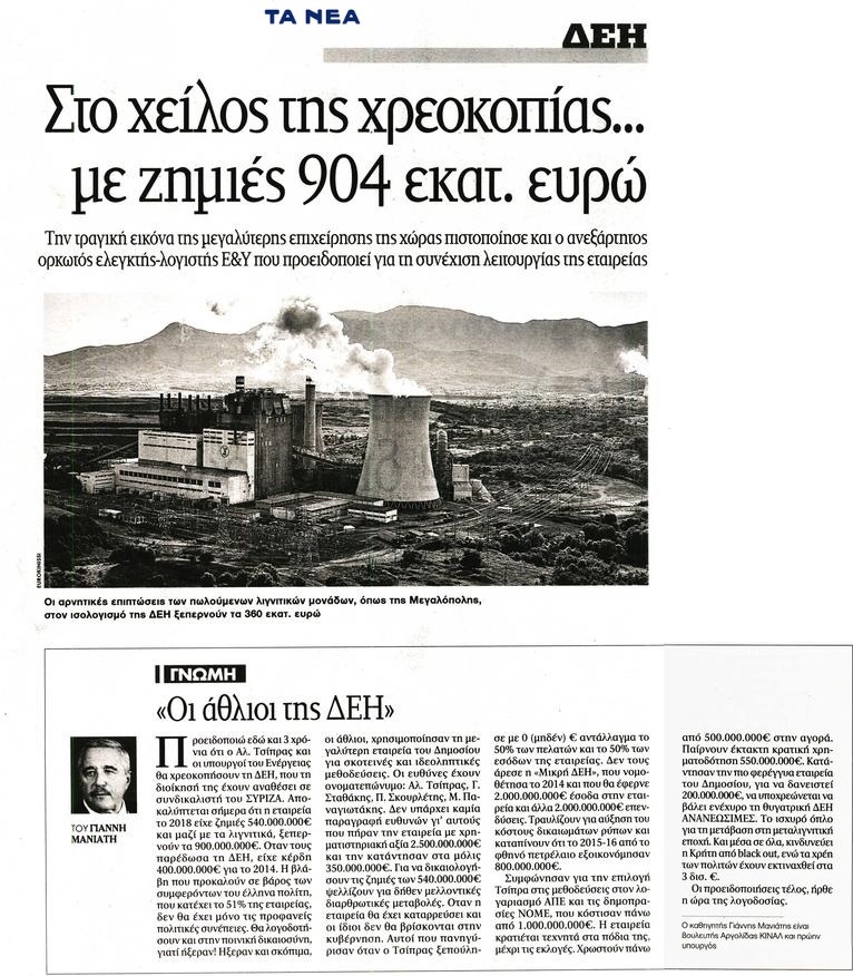 Συμφώνησαν για την επιλογή Τσίπρα στις μεθοδεύσεις στο λογαριασμό ΑΠΕ και τις δημοπρασίες ΝΟΜΕ, που κόστισαν πάνω από 1.000.000.000€. Η εταιρεία κρατιέται τεχνητά στα πόδια της, μέχρι τις εκλογές. Χρωστούν πάνω από 500.000.000€ στην αγορά. Παίρνουν έκτακτη κρατική χρηματοδότηση 550.000.000€. Κατάντησαν την πιο φερέγγυα εταιρεία του δημοσίου, για να δανειστεί 200.000.000€, να υποχρεώνεται να βάλει ενέχυρο τη θυγατρική «ΔΕΗ ΑΝΑΝΕΩΣΙΜΕΣ». Το ισχυρό όπλο για τη μετάβαση στη μεταλιγνιτική εποχή. Και μέσα σε όλα, κινδυνεύει η Κρήτη από black out, ενώ τα χρέη των πολιτών έχουν εκτιναχθεί στα 3 δις €.