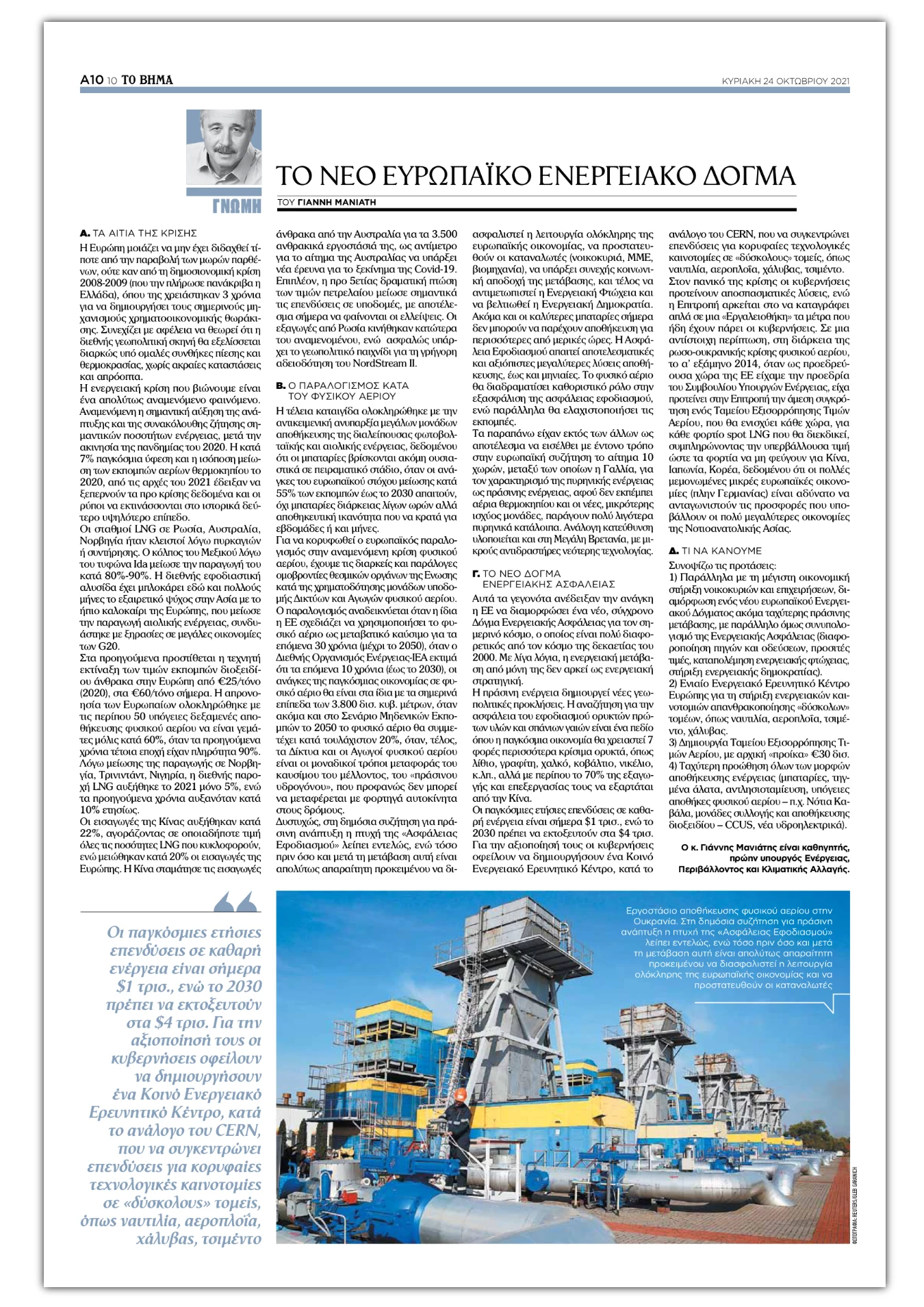 Η Ενεργειακή κρίση που βιώνουμε, είναι ένα απολύτως αναμενόμενο φαινόμενο. Αναμενόμενη η σημαντική αύξηση της ανάπτυξης και της συνακόλουθης ζήτησης σημαντικών ποσοτήτων ενέργειας, μετά την ακινησία της πανδημίας του 2020. Η κατά 7% παγκόσμια ύφεση και η ισόποση μείωση των εκπομπών αερίων θερμοκηπίου το 2020, από τις αρχές του 2021 έδειξε να ξεπερνά τα προ κρίσης δεδομένα και οι ρύποι να εκτινάσσονται στο ιστορικά δεύτερο υψηλότερο επίπεδο. Οι σταθμοί LNG σε Ρωσία, Αυστραλία, Νορβηγία, ήταν κλειστοί λόγω πυρκαγιών, ή συντήρησης. Ο κόλπος του Μεξικού λόγω του τυφώνα Ida μείωσε την παραγωγή του κατά 80-90%. Η διεθνής εφοδιαστική αλυσίδα έχει μπλοκάρει εδώ και πολλούς μήνες, τo εξαιρετικό ψύχος στην Ασία, με το ήπιο καλοκαίρι της Ευρώπης, που μείωσε την παραγωγή αιολικής ενέργειας, συνδυάστηκε με ξηρασίες σε μεγάλες οικονομίες των G20. Στα προηγούμενα προστίθεται η τεχνητή εκτίναξη των τιμών εκπομπών διοξειδίου άνθρακα στην Ευρώπη από €25/τόνο (2020), στα €60/τόνο σήμερα. Η απρονοησία των Ευρωπαίων ολοκληρώθηκε με τις περίπου 50 υπόγειες δεξαμενές αποθήκευσης φυσικού αερίου να είναι γεμάτες μόλις κατά 60%, όταν τα προηγούμενα χρόνια τέτοια εποχή, είχαν πληρότητα 90%. Λόγω μείωσης της παραγωγής σε Νορβηγία, Τρινιντάντ, Νιγηρία, η διεθνής παροχή LNG αυξήθηκε το 2021 μόνο 5%, ενώ τα προηγούμενα χρόνια, αυξανόταν κατά 10% ετησίως. Οι εισαγωγές της Κίνας αυξήθηκαν κατά 22%, αγοράζοντας σε οποιαδήποτε τιμή όλες τις ποσότητες LNG που κυκλοφορούν, ενώ μειώθηκαν κατά 20% οι εισαγωγές της Ευρώπης. Η Κίνα σταμάτησε τις εισαγωγές άνθρακα από την Αυστραλία για τα 3.500 ανθρακικά εργοστάσιά της, ως αντίμετρο για το αίτημα της Αυστραλίας να υπάρξει νέα έρευνα για το ξεκίνημα της Covid-19. Επιπλέον, η προ 5ετίας δραματική πτώση των τιμών πετρελαίου, μείωσε σημαντικά τις επενδύσεις σε υποδομές, με αποτέλεσμα σήμερα να φαίνονται οι ελλείψεις. Οι εξαγωγές από Ρωσία κινήθηκαν κατώτερα του αναμενόμενου, ενώ ασφαλώς υπάρχει το γεωπολιτικό παιχνίδι για τη γρήγορη αδειοδότηση του ΝordStreαm ΙΙ.