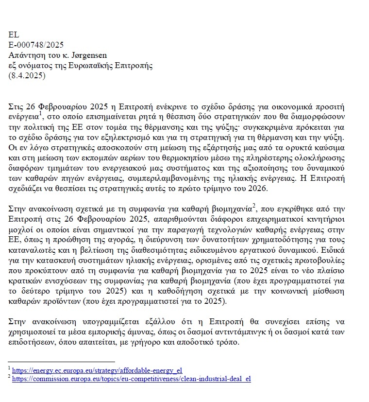 Σε απάντηση της ερώτησης του Ευρωβουλευτή του ΠΑΣΟΚ και Αντιπροέδρου της Ομάδας των Ευρωπαίων Σοσιαλιστών και Δημοκρατών (S&D) Καθ. Γιάννη Μανιάτη, σχετικά με την απουσία νέας στρατηγικής για θέρμανση και ψύξη στην Ε.Ε., ο αρμόδιος Επίτροπος Ενέργειας Dan Jørgensen δεσμεύτηκε: «να θεσπίσει δύο στρατηγικές σχετιζόμενες με την θέρμανση και την ψύξη: το Σχέδιο Δράσης για τον Εξηλεκτρισμό και τη Στρατηγική για τη Θέρμανση και την Ψύξη», καθώς και ότι «θα συνεχίσει επίσης να χρησιμοποιεί τα μέσα εμπορικής άμυνας, όπου απαιτείται, με γρήγορο και αποδοτικό τρόπο».
