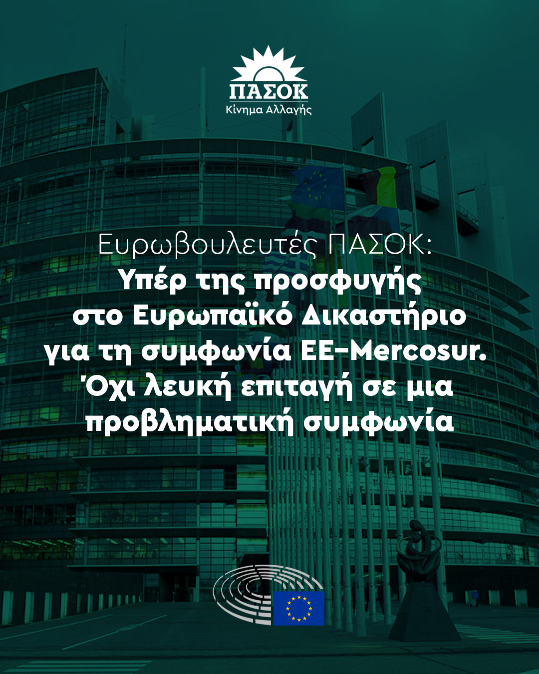 Υπενθυμίζεται ότι στην Ολομέλεια του Δεκεμβρίου το ΠΑΣΟΚ καταψήφισε τους μη επαρκείς μηχανισμούς που παρουσιάστηκαν ως “δήθεν προστασία” των αγροτών, στο πλαίσιο της συμφωνίας ΕΕ–Mercosur, όπως έχει δημόσια και τεκμηριωμένα τοποθετηθεί. Η στήριξη της προσφυγής στο Δικαστήριο αποτελεί αναγκαίο θεσμικό βήμα για διαφάνεια, νομική σαφήνεια και ουσιαστικό πολιτικό έλεγχο, πριν ληφθούν αποφάσεις με μακροπρόθεσμες και μη αναστρέψιμες συνέπειες για την Eυρωπαϊκή αγροτική παραγωγή, το περιβάλλον και τη δημοκρατική λειτουργία της Ένωσης.