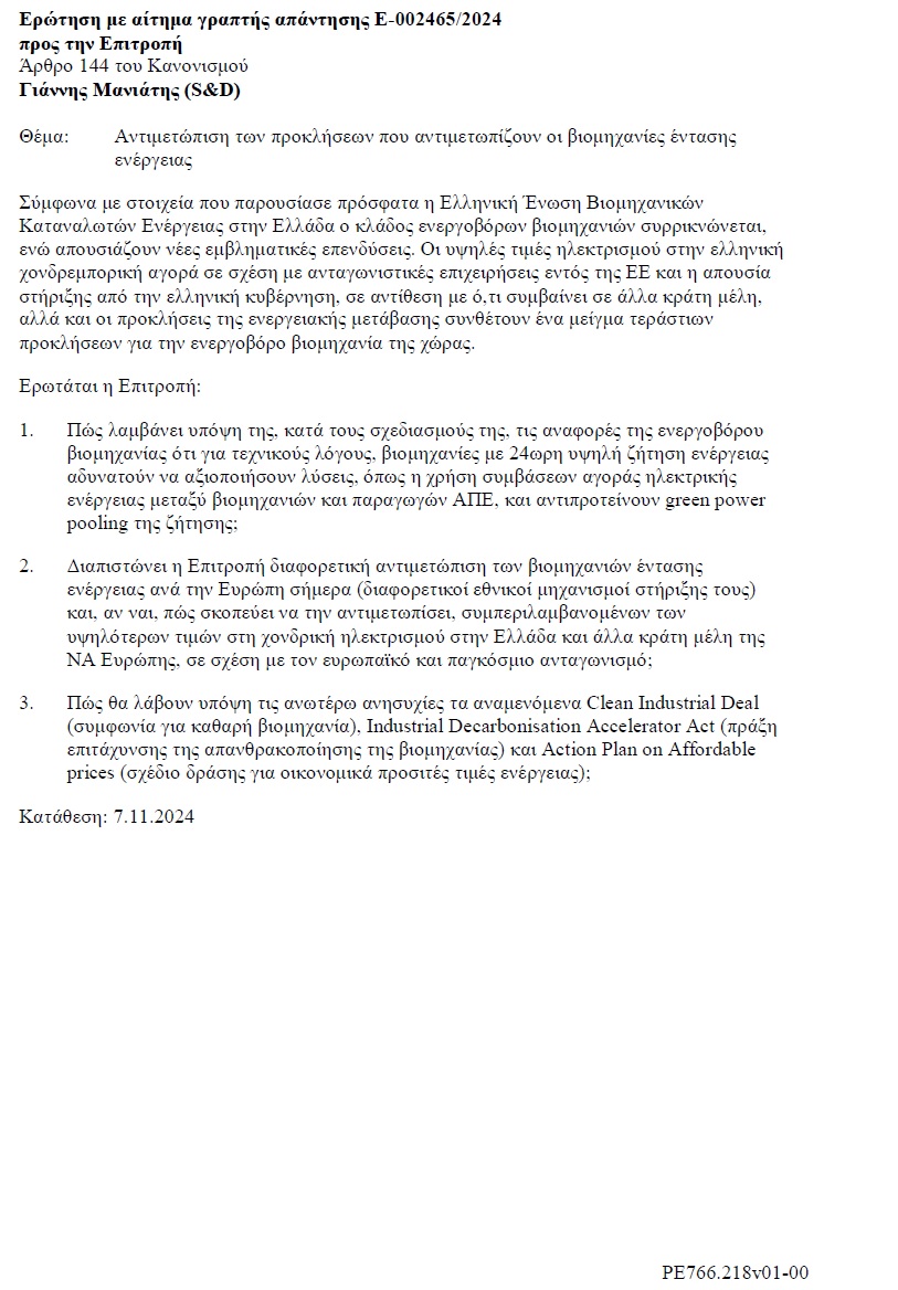 Πιο συγκεκριμένα, σε ερώτηση του Ευρωβουλευτή του ΠΑΣΟΚ και Αντιπροέδρου της Ομάδας των Ευρωπαίων Σοσιαλιστών και Δημοκρατών, Γ. Μανιάτη, προς την Επίτροπο Ενέργειας Kadri Simson και στην αντίστοιχη απάντησή της, καταγράφεται η εξής τραγελαφική κατάσταση: