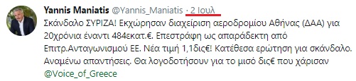 «Η ΝΔ μπορεί να είναι πρώτη στις δημοσκοπήσεις, αλλά ουραγός στις πολιτικές προστασίας του δημόσιου συμφέροντος. Σήμερα, με καθυστέρηση 4 μηνών, “ανακαλύπτει” το σκάνδαλο ΣΥΡΙΖΑ για την εκχώρηση της Διαχείρισης του Αεροδρομίου Αθήνας (ΔΑΑ), χαρίζοντας μισό δις €. Σκάνδαλο που αποκαλύψαμε από τις 2 Ιουλίου 2018 και μέχρι σήμερα δεν έχουμε πάρει καμία απάντηση από τους Υπουργούς Ε. Τσακαλώτο και Χρ. Σπίρτζη».