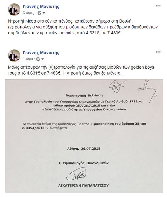 Μετά από παρέμβαση του Γιάννη Μανιάτη σήμερα στη Βουλή κατά τη συζήτηση νσχ του ΥΠΟΙΚ, η κυβέρνηση ΣΥΡΙΖΑΝΕΛ απέσυρε σχετική (ν)τροπολογία της για αυξήσεις μισθών των golden boys τους από 4.631€ σε 7.483€.