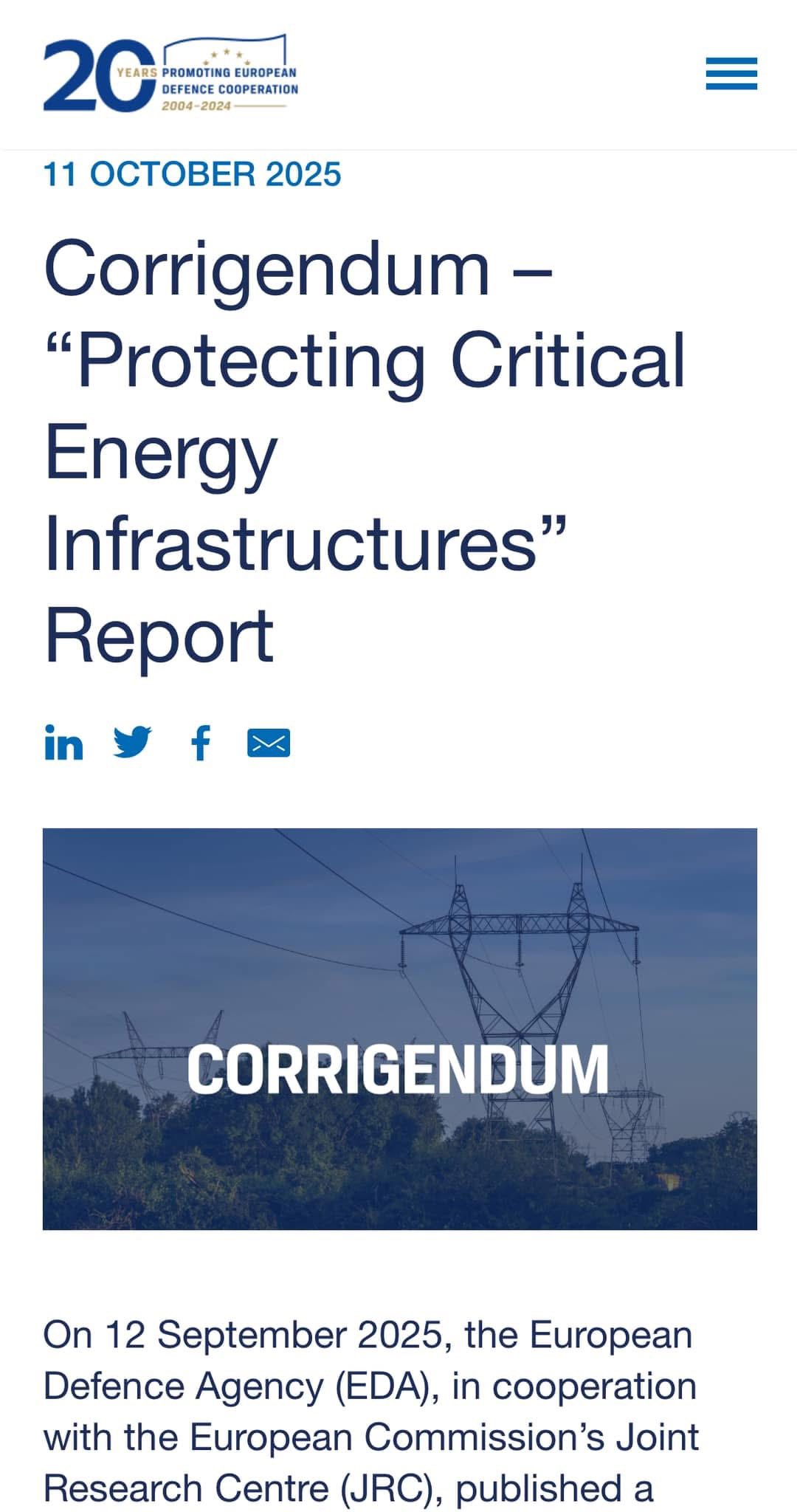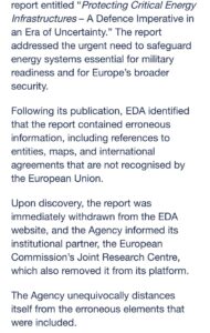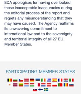«Με δημόσια ανάρτησή του, ο Ευρωπαϊκός Οργανισμός Άμυνας (EDA) απολογείται, λυπάται και ζητά συγγνώμη για τις “εσφαλμένες πληροφορίες και απαράδεκτες ανακρίβειες”, που περιλαμβάνονται στην μελέτη του για την προστασία των κρίσιμων ευρωπαϊκών ενεργειακών υποδομών, αναφορικά με το Τουρκολιβυκό μνημόνιο και τα Κατεχόμενα.
