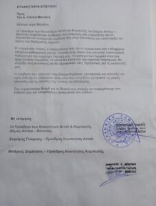 Με πρόσφατη επιστολή τους οι κ.κ. Ζαφείρης και Μπάρκας, Πρόεδροι των Κοινοτήτων Αετού και Κομπωτής του Δήμου Ακτίου – Βόνιτσας Αιτωλοακαρνανίας, ενημέρωσαν τον Γ. Μανιάτη για την πρόοδο του έργου του φράγματος Αχυρών κι εξέφρασαν τις ευχαριστίες τους προς το πρόσωπό του για τη στήριξη που έχει παράσχει.