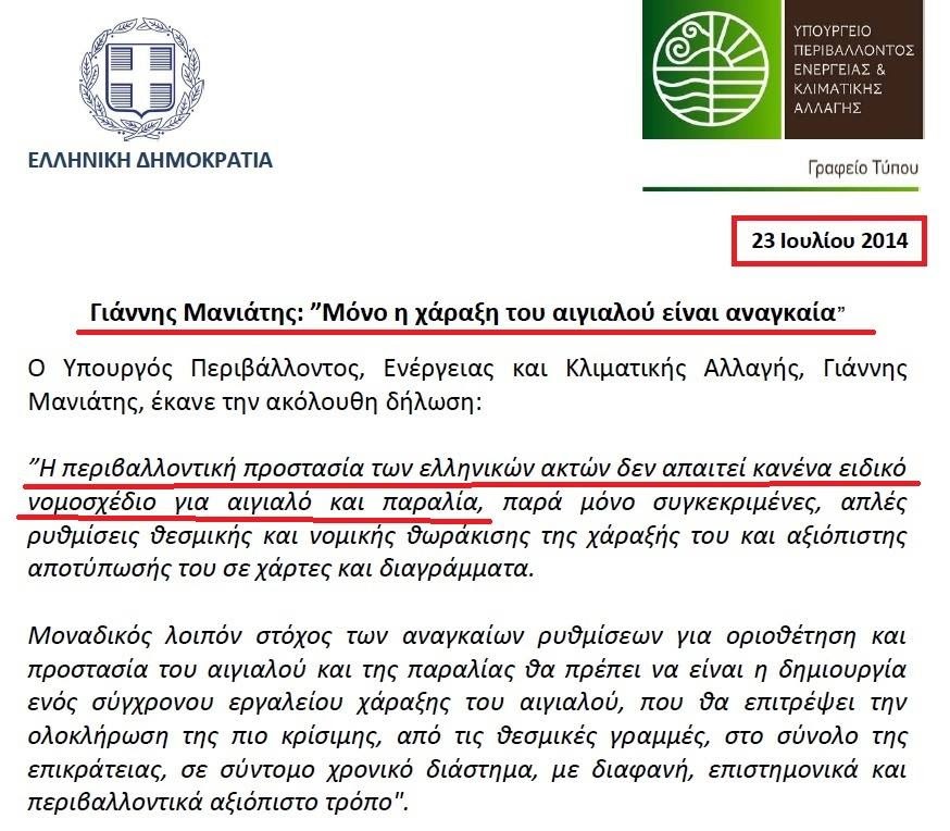 “Οι υποκριτές επαγγελματίες προστάτες περιβάλλοντος του ΣΥΡΙΖΑ θα ψηφίσουν μαζικές «τακτοποιήσεις» στον αιγιαλό;; Διατάξεις ευνοϊκότερες για τους παρανομούντες, σε σχέση με αυτές που μας ζητούσε η τρόικα το 2014. Ως υπουργός Περιβάλλοντος, με επίσημο δελτίο τύπου, αρνήθηκα να υπογράψω κι έτσι σταμάτησε κάθε προσπάθεια της τρόικας. Τώρα, με τον Αλ. Τσίπρα, που τα ξεπουλάει όλα, τι θα κάνουν;;”