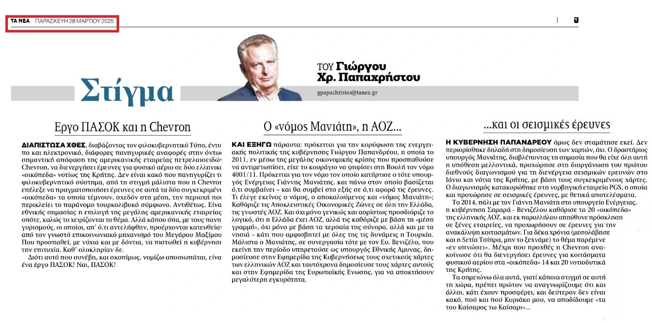 Έργο ΠΑΣΟΚ με την η υπογραφή Γιάννη Μανιάτη χαρακτηρίζει το ενδιαφέρον για τους ελληνικούς υδρογονάνθρακες του αμερικανικού ενεργειακού κολοσσού, Chevron, o Γιώργος Παπαχρήστος στη στήλη του Στίγμα στα Νέα. Συγκεκριμένα, ο δημοσιογράφος τονίζει πως μπορεί να βλέπουμε τα πανηγύρια της κυβέρνησης αναφορικά με το πράσινο φως στη Chevron για εξορύξεις σε δύο οικόπεδα νότια της Κρήτης και δη σε περιοχές που τέμνουν το παράνομο τουρκολιβυκό σύμφωνο, αλλά «κάπου όπα».