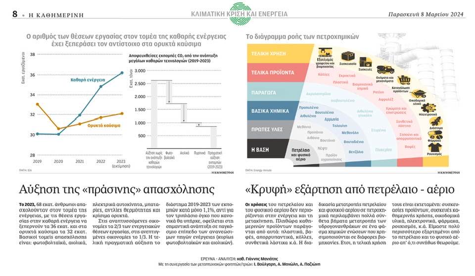 Οι Ανανεώσιμες Πηγές Ενέργειας δημιούργησαν 36 εκατ νέες θέσεις εργασίας και μείωσαν στο 1/3 τις εκπομπές αέριων ρύπων (Η ΚΑΘΗΜΕΡΙΝΗ, 08.03.2024)