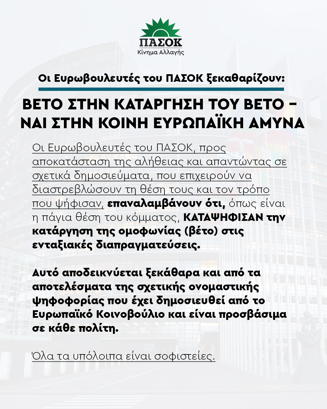 Οι Ευρωβουλευτές του ΠΑΣΟΚ, προς αποκατάσταση της αλήθειας και απαντώντας σε σχετικά δημοσιεύματα, που επιχειρούν να διαστρεβλώσουν τη θέση τους και τον τρόπο που ψήφισαν, επαναλαμβάνουν ότι, όπως είναι η πάγια θέση του κόμματος, ΚΑΤΑΨΗΦΙΣΑΝ την κατάργηση της ομοφωνίας (βέτο) στις ενταξιακές διαπραγματεύσεις. Αυτό αποδεικνύεται ξεκάθαρα και από τα αποτελέσματα της σχετικής ονομαστικής ψηφοφορίας που έχει δημοσιευθεί από το Ευρωπαϊκό Κοινοβούλιο και είναι προσβάσιμα σε κάθε πολίτη. Όλα τα υπόλοιπα είναι σοφιστείες.