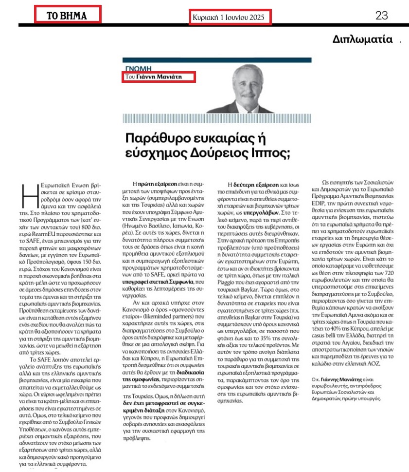 Ως εισηγητής των Σοσιαλιστών και Δημοκρατών για το Ευρωπαϊκό Πρόγραμμα Αμυντικής Βιομηχανίας EDIP, την πρώτη συνεκτική νομοθεσία για ενίσχυση της Ευρωπαϊκής Αμυντικής Βιομηχανίας, πιστεύω ότι τα Ευρωπαϊκά χρήματα θα πρέπει να χρηματοδοτούν ευρωπαϊκές εταιρείες και τη δημιουργία θέσεων εργασίας στην Ευρώπη και όχι να επιδοτούν την αμυντική Βιομηχανία τρίτων χωρών. Είναι κάτι το οποίο καταφέραμε να υιοθετήσουμε ως θέση στην πλειοψηφία των 720 Ευρωβουλευτών και την οποία θα υπερασπιστούμε στις επικείμενες διαπραγματεύσεις με το Συμβούλιο, περιορίζοντας όσο γίνεται την επιθυμία κάποιων κρατών να ανοίξουν την Ευρωπαϊκή Άμυνα ακόμα και σε τρίτες χώρες όπως η Τουρκία που κατέχει το 40% της Κύπρου, απειλεί με casus belli την Ελλάδα, διατηρεί τη στρατιά του Αιγαίου, διεκδικεί την αποστρατιωτικοποίηση των νησιών και παρεμποδίζει τις έρευνες για το καλώδιο στην ελληνική ΑΟΖ.