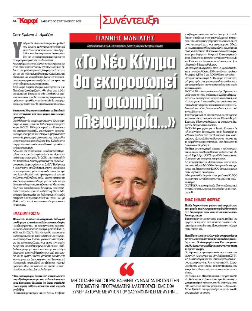 «Μαζί Μπροστά». Για ένα σύγχρονο, ευρωπαϊκό Σοσιαλδημοκρατικό Κίνημα, μετεξέλιξη ΠΑΣΟΚ και ΔΗΣΥ. Το νέο Κίνημα θα εκπροσωπεί τους σημερινούς μη προνομιούχους, το σύγχρονο «πρεκαριάτο». Όσους βρίσκονται στο περιθώριο και την ανασφάλεια, τους εκτός των τειχών. Άνεργους, κακοπληρωμένους ιδιωτικούς υπαλλήλους, μικρομεσαίους που καταρρέουν λόγω δήμευσης του εισοδήματός τους από την εφορία και το κράτος. Τη νέα γενιά της γνώσης, της καινοτομίας, της δημιουργικότητας. Τη σιωπηλή πλειοψηφία που αναζητά μια αξιόπιστη πολιτική πρόταση.