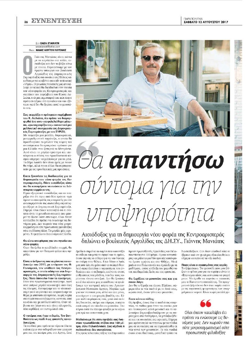 O Γιάννης Μανιάτης είναι πάντα με το χαμόγελο στα χείλη, αισιόδοξος και δεν το βάζει κάτω με τίποτα. Περπατήσαμε με τον πρώην υπουργό και βουλευτή της Δημοκρατικής Συμπαράταξης στα σοκάκια της Πλάκας και αράξαμε για κουβέντα στο café-restaurant Υδρία. Ο γνωστός πολιτικός αποκαλύπτει αν τελικά θα διεκδικήσει την ηγεσία του νέου φορέα της Κεντροαριστεράς και σχολιάζει την παρέμβαση του Κώστα Λαλιώτη. Ο βουλευτής Αργολίδας αποκάλυψε πως έκανε πρόταση γάμου στην γυναίκα του ενώ εξηγεί γιατί δεν θα ξυρίσει ποτέ το μουστάκι του.