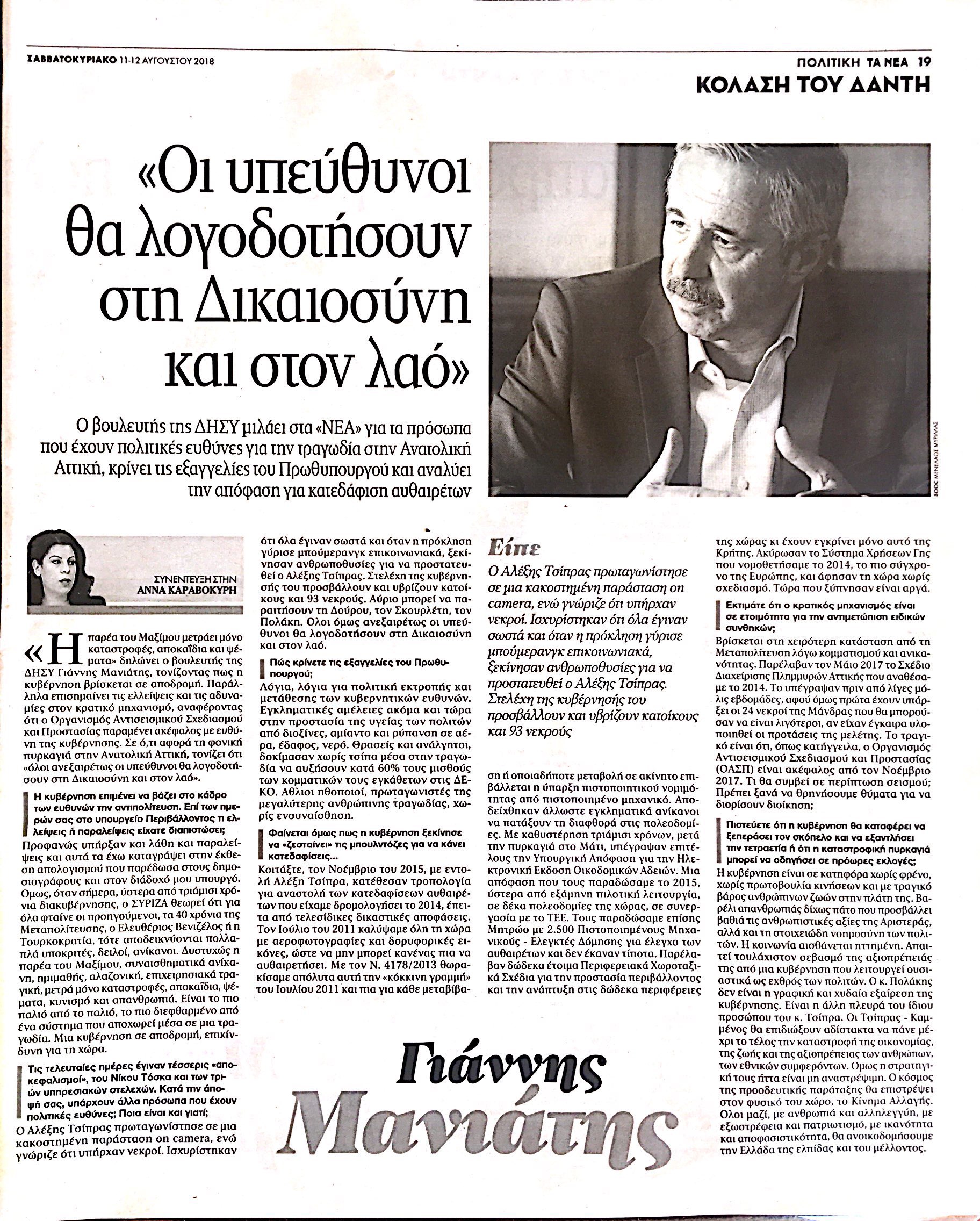 Ο Α. Τσίπρας πρωταγωνίστησε, σε μια κακοστημένη παράσταση on camera, ενώ γνώριζε ότι υπήρχαν νεκροί. Ισχυρίστηκαν ότι όλα έγιναν σωστά και όταν η πρόκληση γύρισε μπούμερανγκ επικοινωνιακά, ξεκίνησαν ανθρωποθυσίες για να προστατευθεί ο Α. Τσίπρας. Στελέχη της κυβέρνησής του, προσβάλλουν και υβρίζουν κατοίκους και 93 νεκρούς. Αύριο μπορεί να παραιτήσουν τη Δούρου, το Σκουρλέτη, τον Πολάκη. Όλοι όμως ανεξαιρέτως οι υπεύθυνοι, θα λογοδοτήσουν στη δικαιοσύνη και το λαό.