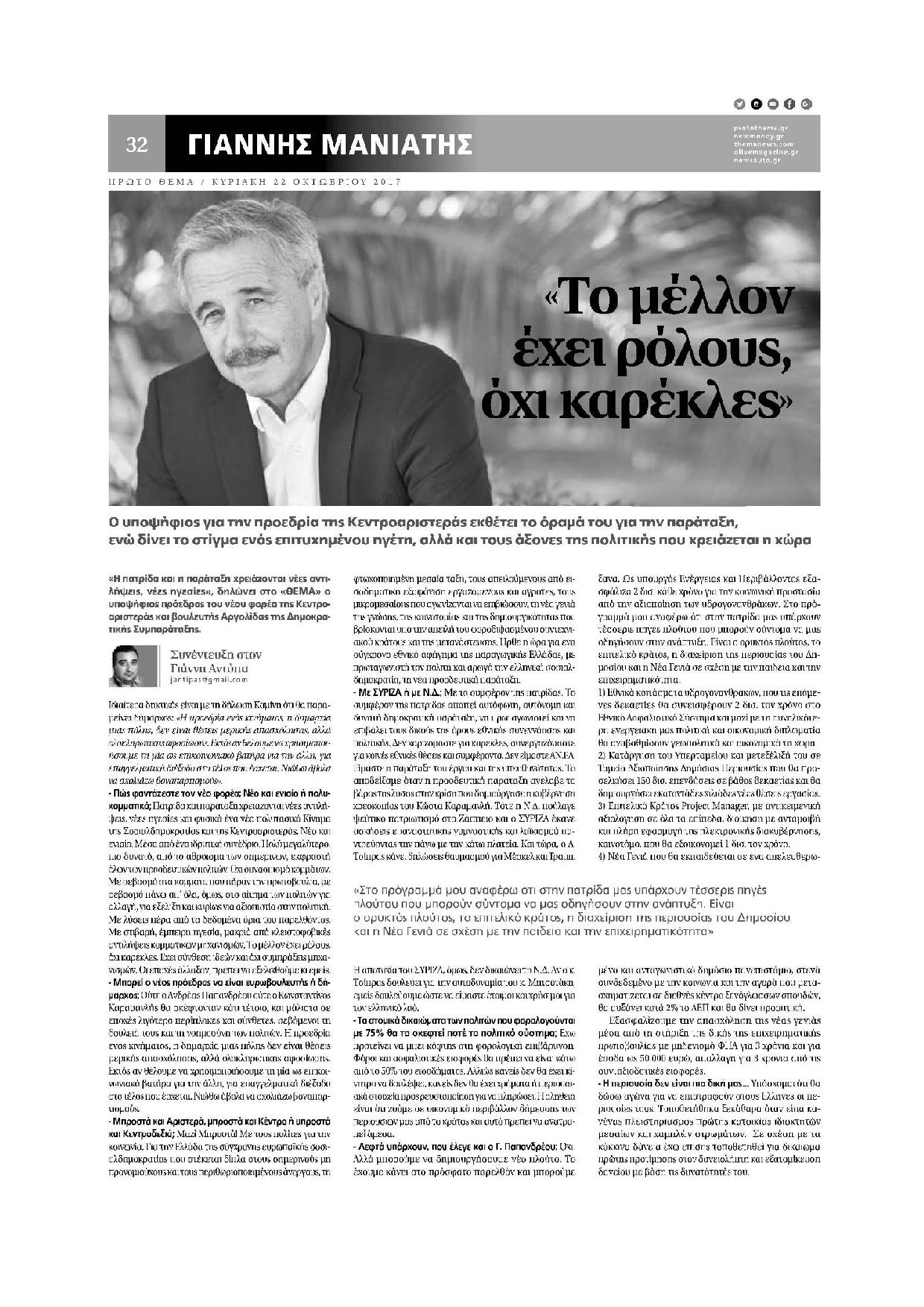 Με λύσεις πέρα από τα δεδομένα όρια του παρελθόντος. Με στιβαρή, έμπειρη ηγεσία, μακριά από κλειστοφοβικές αντιλήψεις κομματικών μηχανισμών. Το μέλλον έχει ρόλους, όχι καρέκλες. Έχει σύνθεση ιδεών κι όχι συμπράξεις μηχανισμών. Οι εποχές άλλαξαν, πρέπει να εξελιχθούμε κι εμείς.