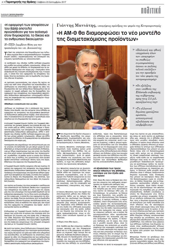Γ.Μ.: Θεωρώ ότι βρισκόμαστε στην πιο κρίσιμη και πιο προκλητικά ιστορική περίοδο της περιοχής και της Ελλάδας. Τώρα πια που αλλάζει το γεωπολιτικό καθεστώς, τώρα που διαπιστώνουμε ότι αλλάζουν και οι ισορροπίες τόσο στο κομμάτι των μεταφορών όσο και στο κομμάτι της ενέργειας, αυτή η γωνιά της Ευρώπης, η ΑΜ-Θ, μπορεί πράγματι να αποτελέσει ένα νέο σπουδαίο πυλώνα για τη διαμόρφωση ενός νέου μοντέλου διαμετακόμισης προϊόντων. Κυρίως μέσω σιδηροδρόμου και οδικών αξόνων, και βεβαίως μέσω των αγωγών φυσικού αερίου που αλλάζουν πια πλήρως όλη την ισορροπία στην ευρύτερη περιοχή των ανατολικών Βαλκανίων και της νοτιοανατολικής Ευρώπης.